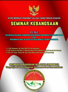 Bertajuk “Pelurusan sejarah Kemerdekaan Bangsa Indonesia 17 Agustus 1945 dan berdirinya Negara Kesatuan Republik Indonesia 18 Agustus 1945 Menuju Taubat Nasional” seminar ini menghadirkan tiga nara sumber. Pertama Ir. Edi Setiawan, SE, M.Si (DPP PCTA Indonesia), R.M. Kusuma Hartana. S (Ketua Harian Situs Persada Soekarno Kediri) dan Prof. Dr. Imam Yahya, M.Ag (Guru Besar UIN Walisongo Semarang). Dan dengan moderator Drs. Ismu Syamsuddin budayawan asal Pekalongan.